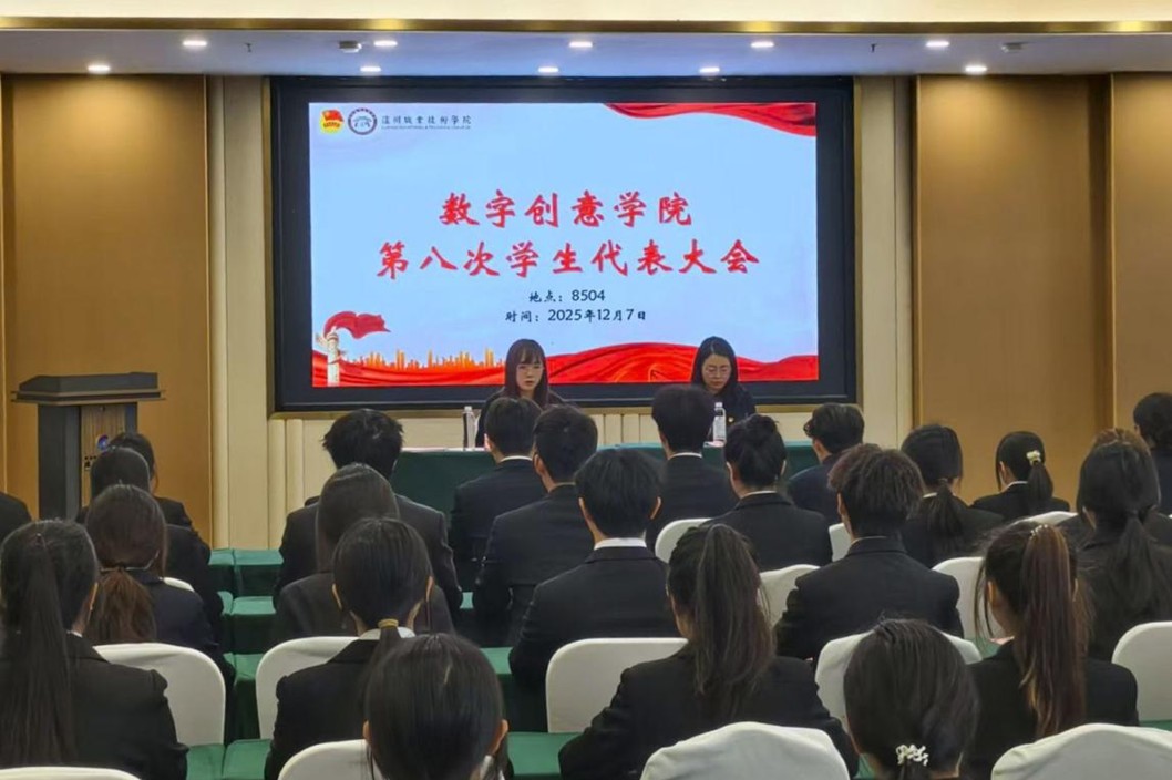 2025年12月7日,数字创意学院在川南公共实训基地8504会议室举行第八次学生代表大会,学院党总支副书记蒲薇以及55名学生代表参加本次会议。会议由数字创意学院团总支书记牟旭主持。