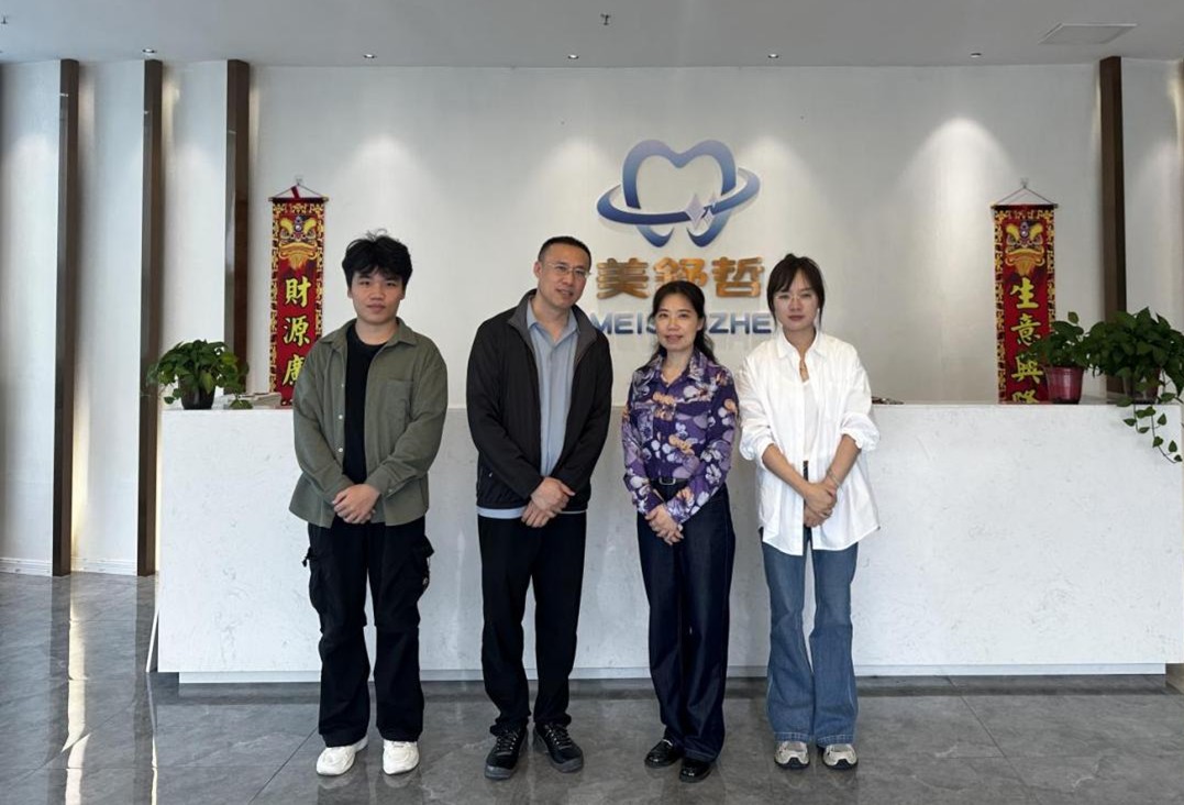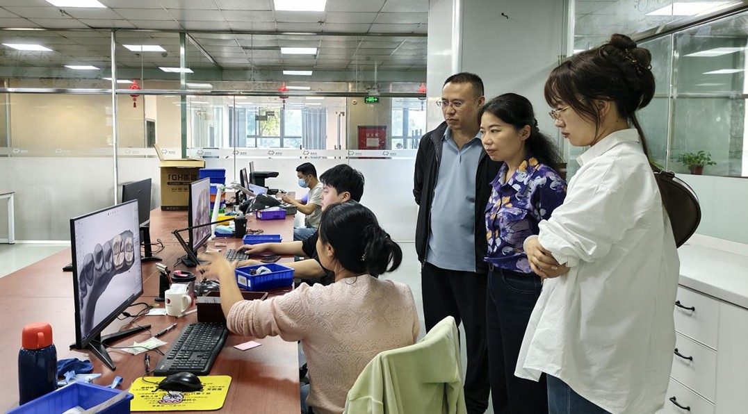 在美舒哲公司总经理杜湘的陪同下,学院团队深入参观了企业的数字化智能制造中心,重点调研了与学院专业核心技能高度契合的数字化建模、数字雕刻与义齿上色等技术岗位。